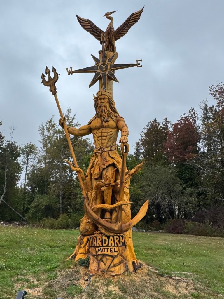 (Searsport). The next time you drive through Searsport on U.S. Hwy One, you’re bound to do what we did – a double take and a double back to get a look at this amazing piece of art at the Yardarm Motel. We talked with owner Wesley Murphy, who tells Downeast Digest they found they needed to remove a giant tree that had stood since the 1800’s – no doubt overseeing the buggies of Sea Captains, the weary travelers embarking for new worlds, the transition to the automobile, and most recently, the reconstruction of US One. Not wanting to see the loss of such a piece of history, Wesley contracted chainsaw artist Josh Landry to create this stunning statue of Poseidon. Take a moment and look closely at the intricate detail! Poseidon – protecting (and now connecting) Searsport’s past to the present, thanks to the good folks at the Yardarm Motel.
